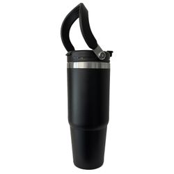 This 30 ounce stainless steel, powder coated, vacuum tumbler keeps drinks hot or cold for a long time. It comes with a high quality top handle which is great for hiking or just easy carrying. The multipurpose flip top lid has an opening for direct drinking or use the built-in straw.