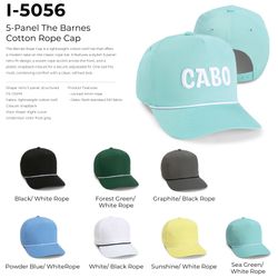 Introducing a contemporary reimagining of the original rope hat with this effortlessly chic lightweight cotton iteration. The Barnes rope caps are meticulously constructed from luxurious cotton twill fabric. This hat showcases a sleek 5-panel 'Retro Fit' design that exudes style. The intricate woven rope accents along the front panel's base elevate the hat with a hint of refined elegance. Complete with a practical plastic snap closure, this hat ensures a snug and secure fit for all-day comfort. OSFM. Comes included with a leatherette, laser engraved patch or embroidery up to 5,000 stitches. Custom patches are available - quote upon request.