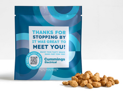"Sofia's Grab & Go Snack Bags offer a gourmet assortment of snack mixes and nuts in perfectly portioned, customizable packaging. Freshly prepared in the USA, these bags are available in a variety of flavors, including Butter Toffee Peanuts, Energy Fruit & Nut Mix, Spicy Guacamole Snack Mix, and Savory Wasabi Snack Mix. Each bag features a sophisticated matte finish with optional product windows and fully customizable branding to showcase your logo or message. Ideal for company events, conferences, golf tournaments, tradeshows, or thoughtful thank-you gifts, these snack bags combine convenience with quality. With premium ingredients and eye-catching design, Sofia's Grab & Go Snack Bags provide an elevated snacking experience that makes a lasting impression."