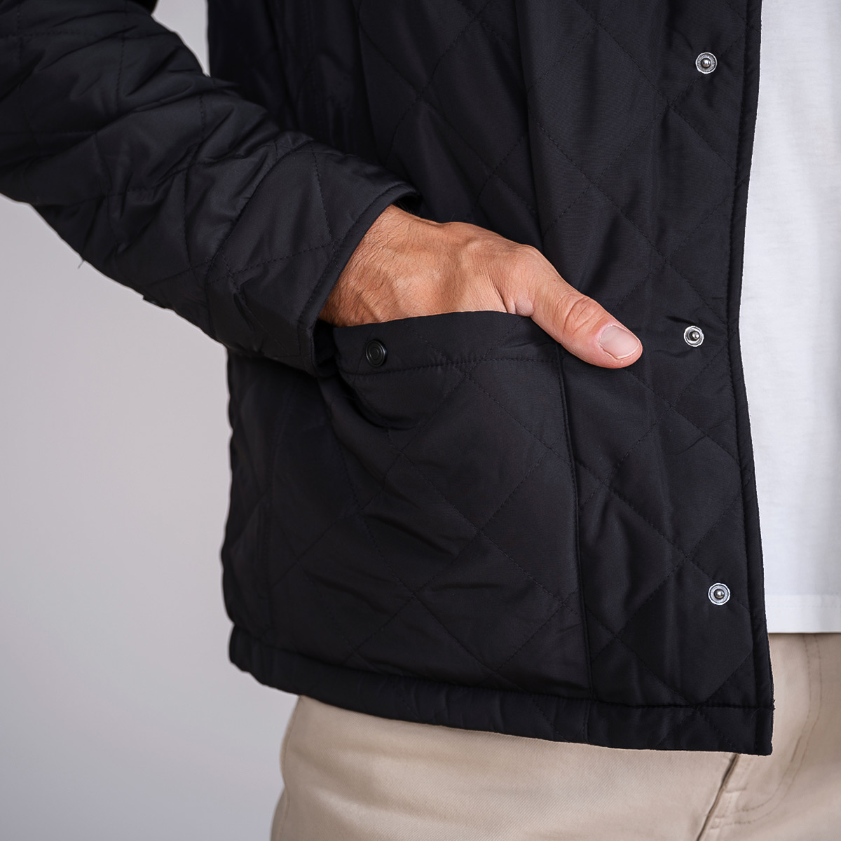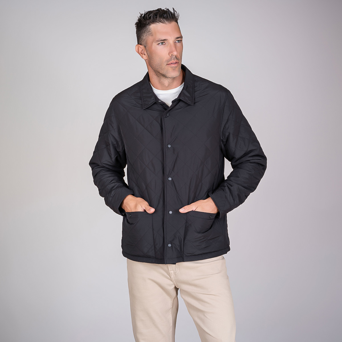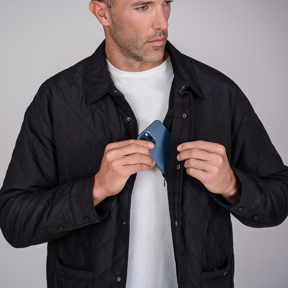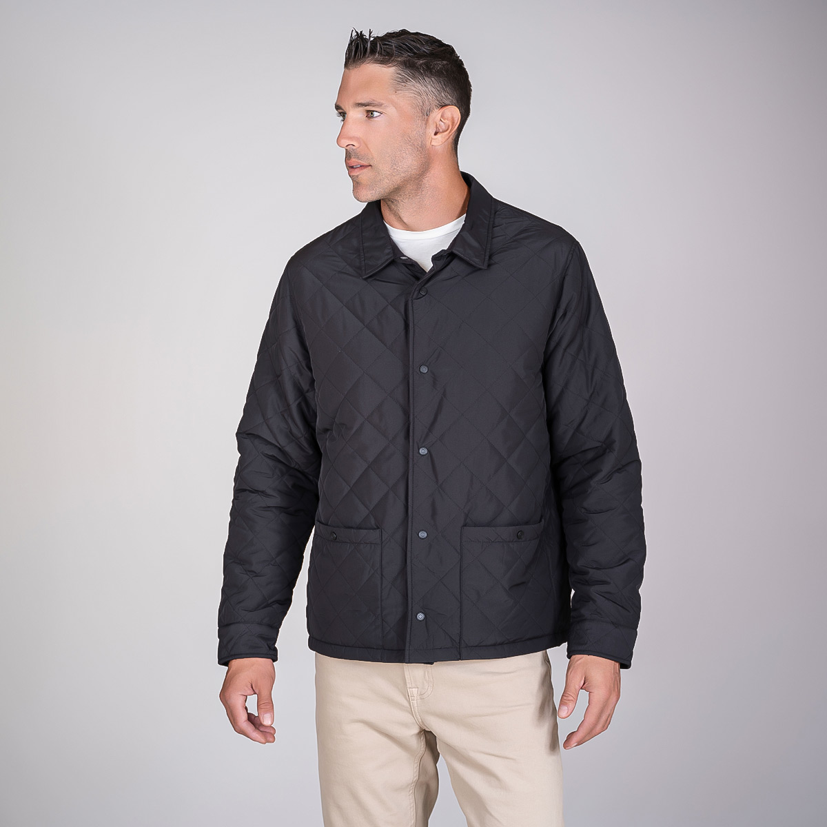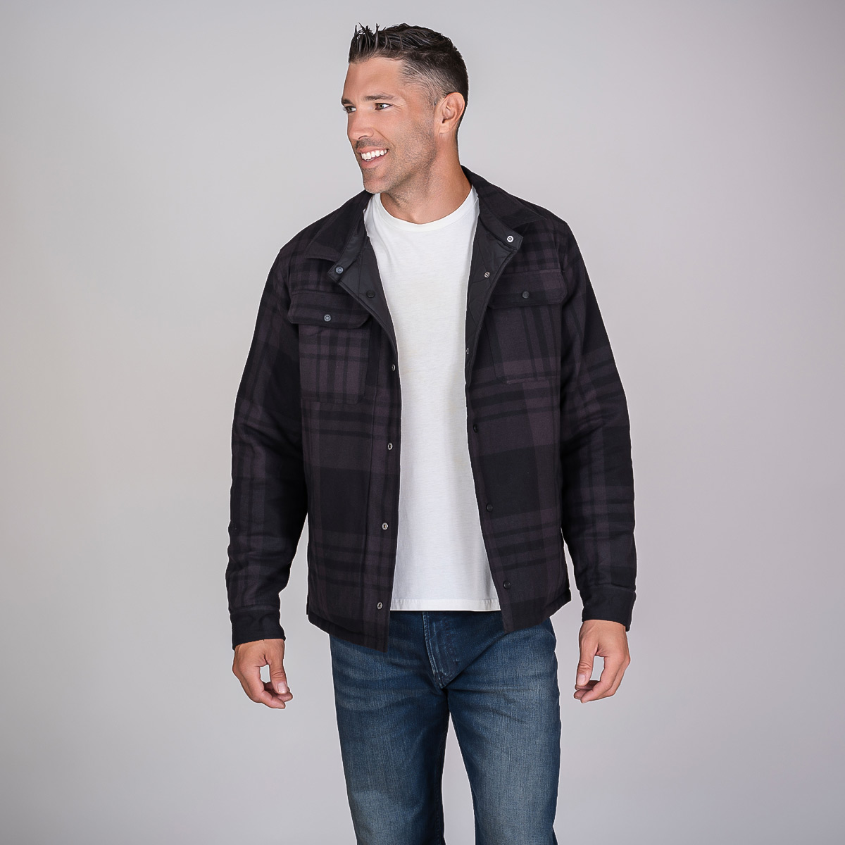 A premium, insulated, reversible jacket that is brimming with style and packed with features. With a diamond quilted polyester exterior and a reversible cotton poly flannel interior, the Diverge is the ultimate 2-in-1 jacket, flip from urban sophistication to rugged countryside in seconds. Made with recycled materials Water resistant exterior free of forever chemicals Subtle, tasteful plaid pattern on reversible interior Interior chest embroidery pocket. Shirt collar, Snap buttons