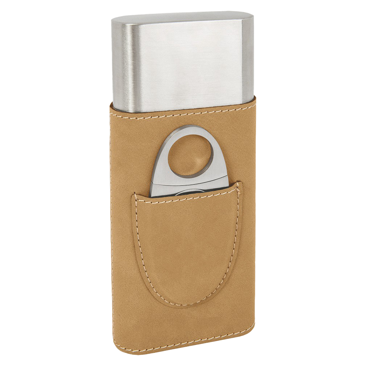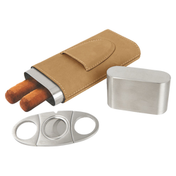 Light Brown Leatherette Cigar Case w/ Cutter is made of synthetic material is water resistant, easy to clean and durable enough for the rigors of daily use. The high quality workmanship of each leatherette piece is sure to impress every recipient with its luxurious individuality. Laser engraved leaving an elegant black imprint. Individually Packaged. To clean, you can use a damp cloth, mild soap, or rubbing alcohol.