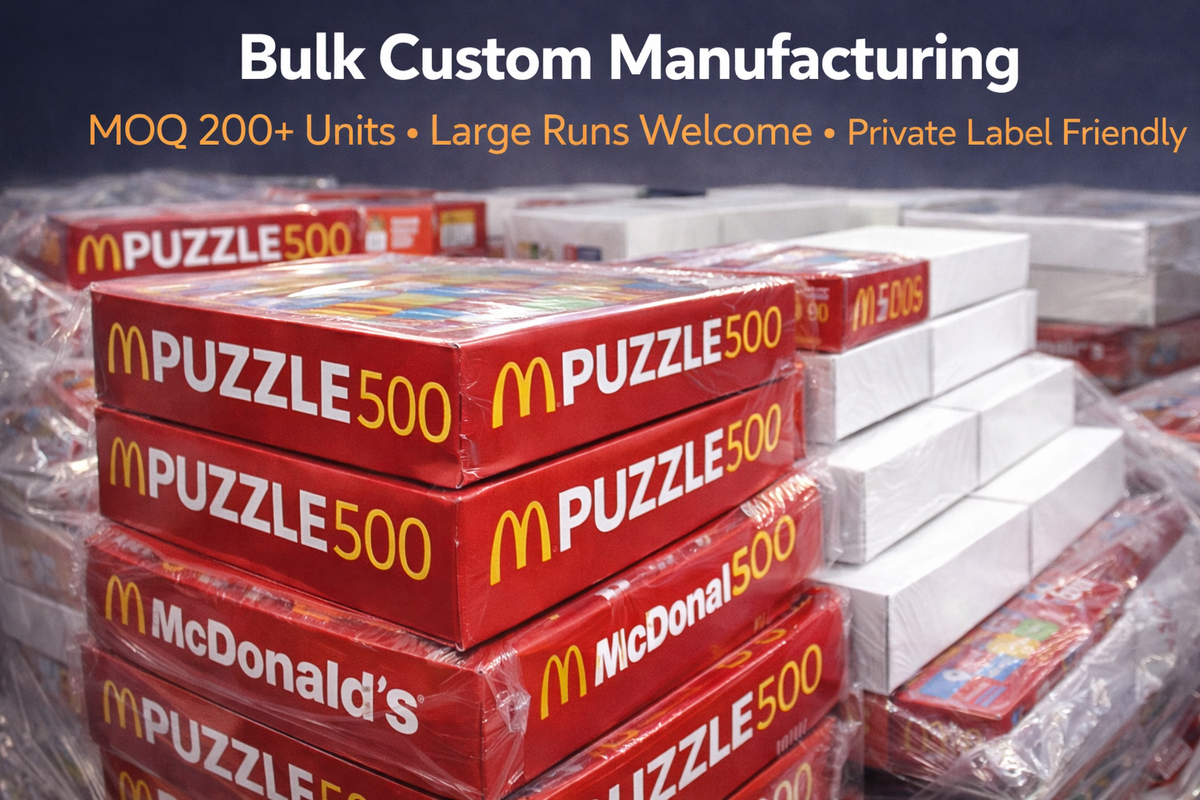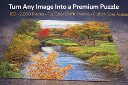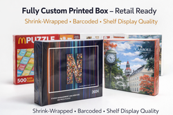 Premium custom jigsaw puzzle manufactured with high-density blue board for superior durability and tight interlocking fit. Fully custom printed puzzle and matching tuck box with full-color CMYK imprint. Retail-ready packaging. Ideal for promotional products, corporate gifts, branded giveaways, fundraising programs, museum gift shops, souvenir programs, and private label retail.