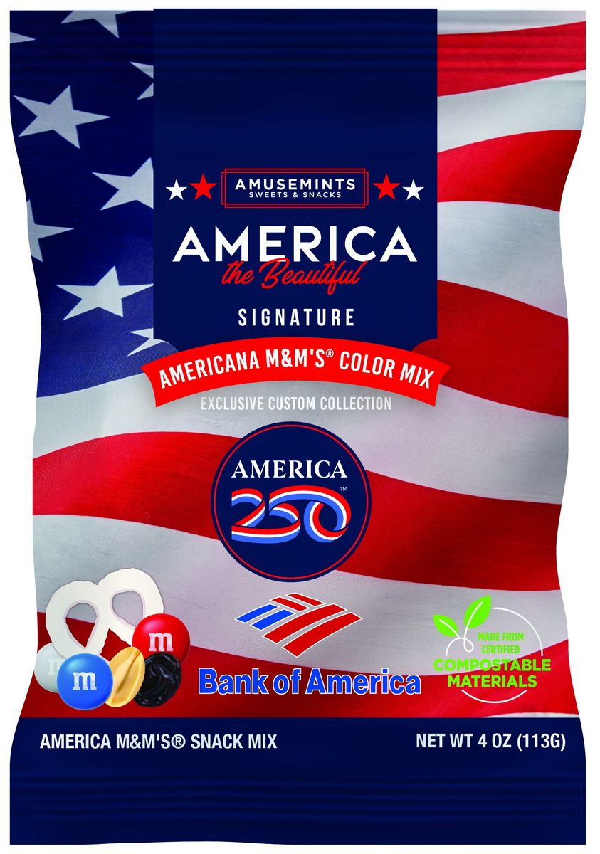 Bring a burst of red, white and blue to every celebration with a customizable Americana M&M'S® Snack Mix. 4 oz. Fully Customizable Eco-Digibag. Filled with Americana Snack Mix - Red, White & Blue M&M'S, yogurt coated mini pretzels, raisins and dry roasted Peanuts. Great for Celebrations, Events, and Giveaways. Please note: Eco bags are fully opaque and do not support clear window options.